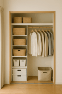 突っ張り棒は、クローゼットの中だけでなく、玄関や洗濯機上のスペースにも応用可能。タオル掛けやカゴと組み合わせれば、オリジナルの収納スペースが簡単に作れます。さらに、折りたたみ式収納ケースは使用しないときにはコンパクトにたためるため、季節物の衣類や雑貨の一時保管にぴったりです。